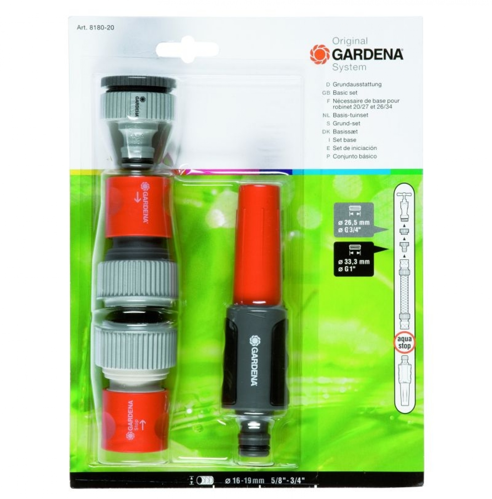 Základní sada 3/4'. Obsah: šroubení, rychlospojka, stopspojka, postřikovač.
